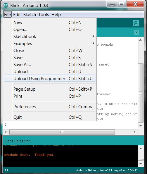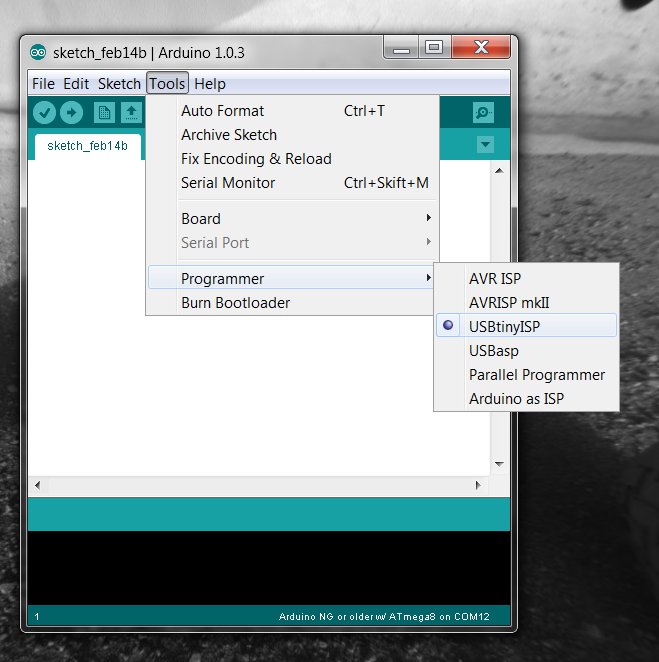 avrdude -c usbtiny -C D:\daniel\programmering\arduino-1.0.3\hardware\tools\avr\etc\avrdude.conf -p m8And got: