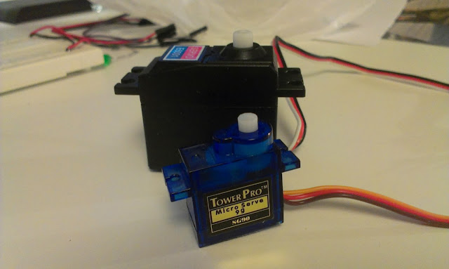 | I bought a new larger servo yesterday, the black large one in the background should provide much more power than the old blue micro servo I used before. |
